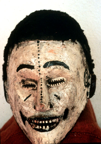 This wood helmet mask, Mmwo, has attached human hair, and black and white pigments.