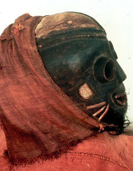 This wood face mask has large eyes and carved teeth, pigments, and a fiber headpiece.