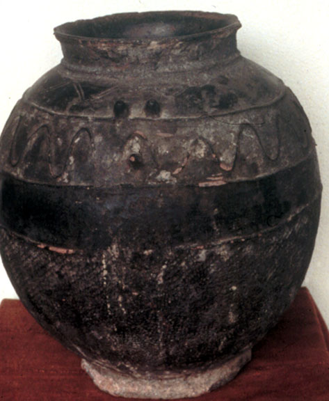 This dark brown pottery vessel is of rounded form with a short wide neck, modeled with various devices.