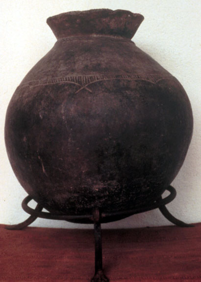 This dark brown pottery vessel is of rounded form, with a short flaring neck and geometric designs.