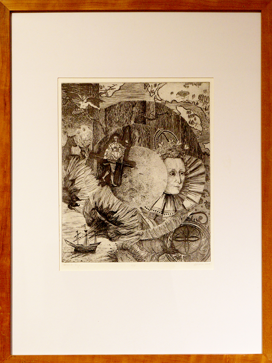 Black and white print of queen with other details; A/P; brown frame, white mat board. Surrealist etching showing (presumably) Queen Elizabeth I off center staring right. The work comprises of swirling motions similar to that found in a Fibonacci sequence.
