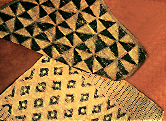 These two cut-pile textiles have geometric designs in brown and cream. They are known as Kasai velvets, woven of raffia palm fiber that has been soaked and beaten to create the velvet-like texture. Once the cloth was woven by men on a small loom, women embroidered it with designs that transmitted information about family history, myths, and moral lessons. Such cloths were used to cover the king's throne or