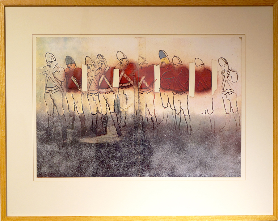Standing figures with red bar obscuring them, dark bar at the feet.