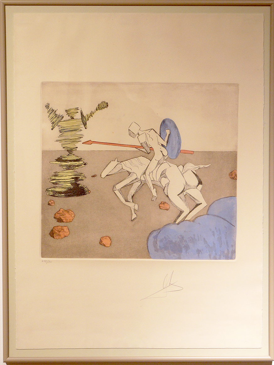 - Printed 1981 Etching and Aquatint Comes from series “Historia de Don Quijote de la mancha.” At the time, Dalí was struggling with Parkinson’s like symptoms in his right hand. Many biographers of Dalí interpret the painting as his personal fight with the physical ailments of aging. Salvador Domingo Felipe Jacinto Dalí i Domènech, Marquis of Dalí de Púbol was a Spanish surrealist artist born in Figueres, Catalonia. He is known for paintings, drawings, photography, sculpture, writing, film, and jewelry. Despite his many talents, his work The Persistence of Memory (1931) is known worldwide and is his most recognizable creation. Salvador Dalí was highly imaginative and enjoyed an eccentric lifestyle. In his early years, he had a brother who passed away and was told by his parents that he was his brother’s reincarnation. His parents supported, if not motivated, him to create sophisticated artowrks and he was sent to drawing school at the age of 12. He adopted surrealism and cubism as his main styles and was heavily influenced by Picasso, who was actually a fan of his work.