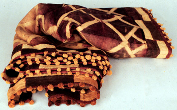 This Kuba resist-dyed Mapel textile has lathe-resist decoration in brown, purple and cream.