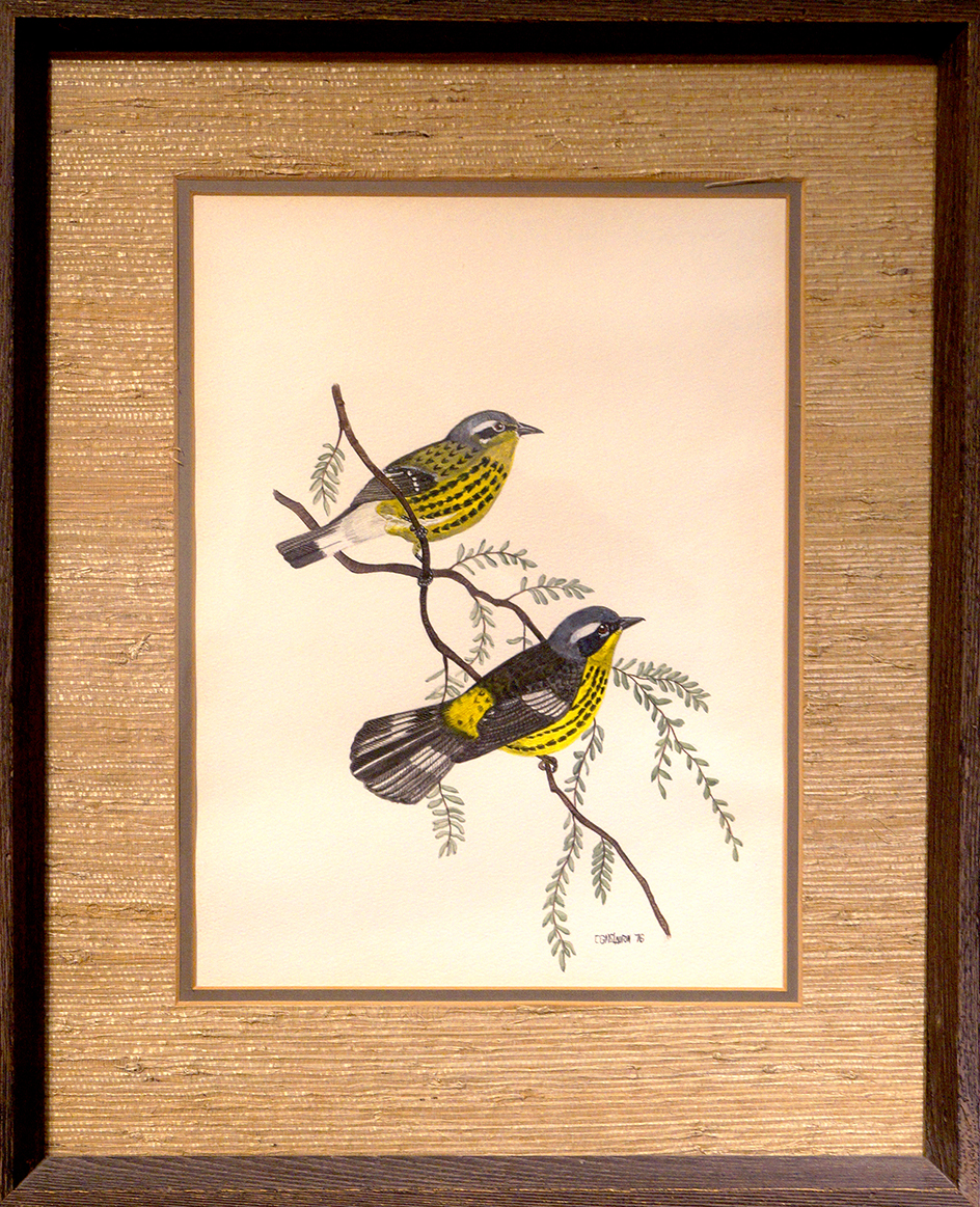 Two birds on a branch; signed; post-it note on front; wood frame.