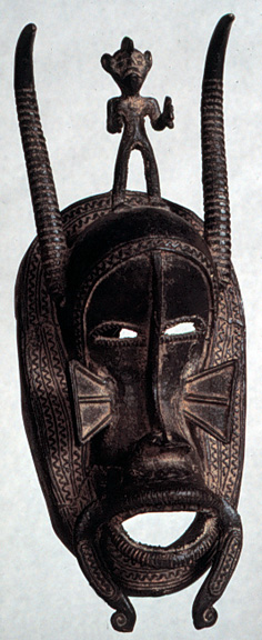 This Senufo Kpelie Society mask is surmounted by a fertility goddess. It is made of bronze with black pigment, and is finely modelled and cast.