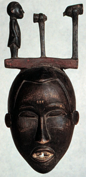 This Guro commemorative ancestral mask, which was used as a chamber shrine or fetish, has residual pigment.