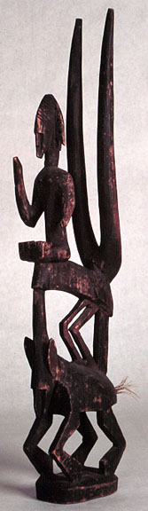 This well-carved Bambara antelopeheaddress from the Bougouni District is conceived as two antelopes in mating position with a seated fertility godeess and a long pair of horns. It is overall age-blackened and has a good patina. 24" Mali.