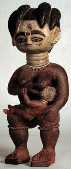 This Ashanti maternity figure is holding a suckling child. It is polychromed with ochre, gray, and black, has beads on each leg at knees, tiny white beads at the neck, a coiffure in six braids, and relief markings on the upper chest. It is a finely carved composition, an excellent piece.