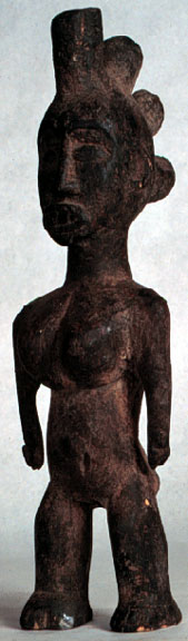 This Vai standing female fertility figurehas a coiffure in large cylinders, encrustation, and a sacrificial patina.