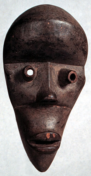 This Dan mask has cylindrical tubular eyes, a pointed chin, and a good patina. [Liberia/Ivory Coast]