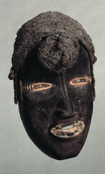 This Dan Poro mask has bas-relief scarification on temples, open, protruding lips, raffia plaited as coiffure, brass bells attached, residual kaolin on nose and eyes, and a fine patina. [Liberia/Ivory Coast]