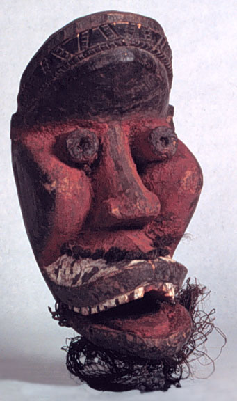 This Dan, Poro Society, Geh mask has a movable lower jaw, protruding cylindrical eyes, and puffed cheeks. It has fiber and fur attached, kaolin and camwood powder, and a patina. [Liberia/ Ivory Coast]