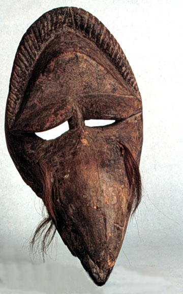 This Dan Geh mask, representing a bird with large beak, has metal pieces in the mouth and monkey hair attached. It is a finely carved, old and encrusted example, with an excellent old use patina.