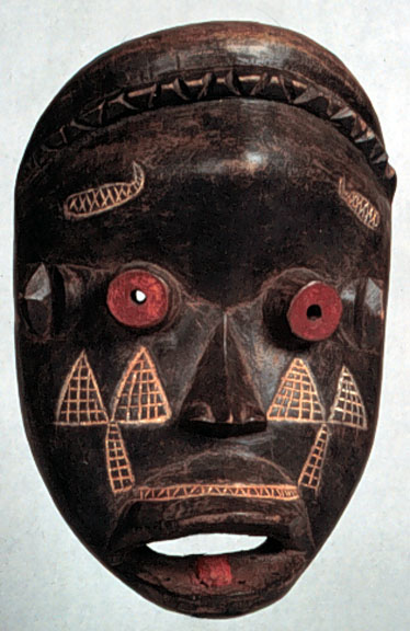 This large Dan N'Guere, Poro Society, mask has large tubular open eyes tipped in red, facial incising, and a serrated crown. It is well-carved, with residual pigment and a good use patina. (The single tooth showing in the photograph is missing at this time.) [Liberia/Ivory Coast]