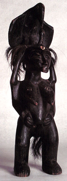 This Senufo shrine altar figure is in the form of a human female with elongated face surmounted by a full figure of Calaou with outspread wings touching a serpent's head (Porpianong) from forehead. It has monkey hair swatches and cowrie shells, with a fine use patina).