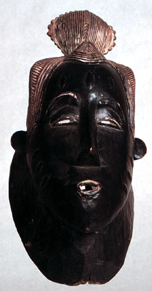This Guro headdress on socle has a linear coiffure terminating in a topknot, late 19th-century style, residual kaolin, and a good patina.