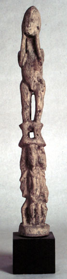 This Dogon kneeling male figure is supported by four standing figures. The piece has overall sacrificial encrustation, and is mounted.