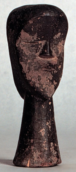 This Dan fetish figure [Liberia / Ivory Coast], with a human face on a conical neck, has a sacrificial patina. A tag attached to the piece reads, "Dan Mace."