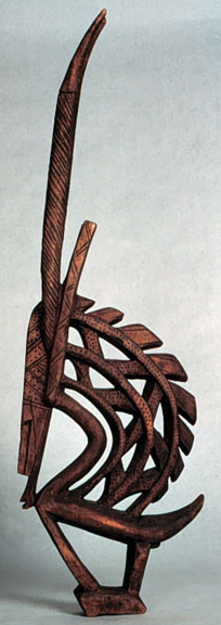 This Bambara chi wara male antelope headdress from the San district is well carved, with a stylized mane and incised lines in extended horns.