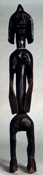 This Chamba/Mumuye standing female ancestral figure has an attenuated arm, enlarged hands, a flanged, serrated coiffure. It is a powerful figure, showing dynamic torsion in arm forms. It is blackened and has a good use patina.