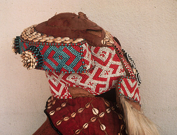 This Mwaash aMboy mask, the most important of all royal Kuba mask forms, is made of wood and fiber, with orange, white, and blue beadwork, shells, and hair suspensions. It is a symbol of the cultural hero Woot, who was responsible for the creation of Kuba royalty, political structure, and arts and crafts.