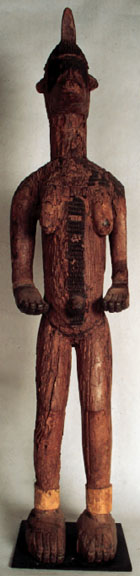 This large Ibo female cult figure is eroded, with residual pigment. With base.