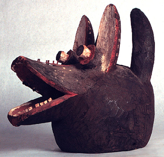 This Mambilla Suah'ba helmet mask headdress from the Cameroon grasslands is a zoomorphic form, finely carved with open mouth with wooden teeth, upright white ears, and projecting eyes. It is an excellent example. With stand.