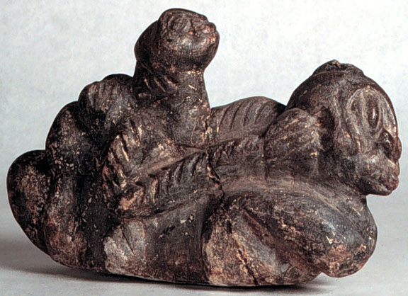 This Kissi stone figure depicts an anthropomorphic figure riding another animal, probably representing a horse. It has a fine patina. [Liberia/Guinea/Sierra Leone]