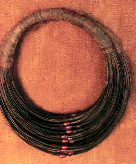 This elephant hair necklace has multiple strands, with red beads and leather binding.